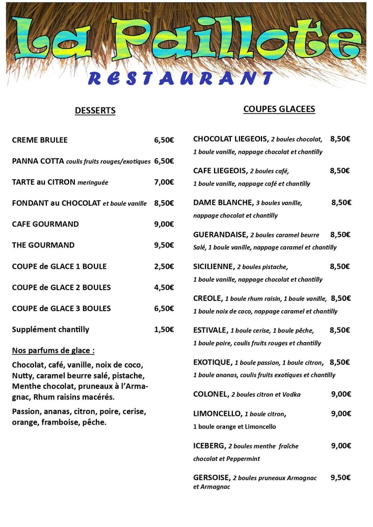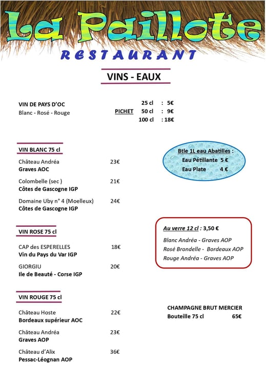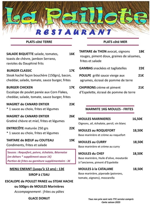 Nouvelle saison, nouvelle équipe, mais un Chef toujours là pour vous régaler. Le Restaurant La Paillote vous présente ses salades gourmandes, ses plats préparés avec soin, une explosion de couleurs dans les desserts et une grande variété de vins à choisir en fonction de vos goûts.
